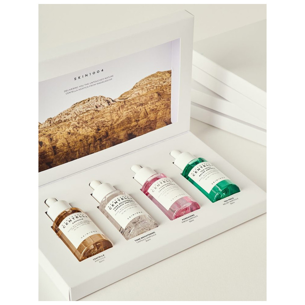 Limitiertes Pflegeset von Skin1004 mit vier Ampullen auf Centella-Basis, die beruhigen, aufhellen, Akne behandeln und die Poren verkleinern - für alle Hauttypen geeignet, auch für empfindliche und zu Akne neigende.