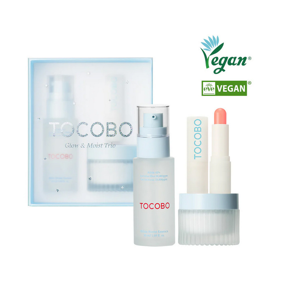 Zlepšete svou péči o pleť pomocí sady Tocobo Glow & Moist Trio, která obsahuje základní veganské produkty pro hydratovanou a zářivou pleť.